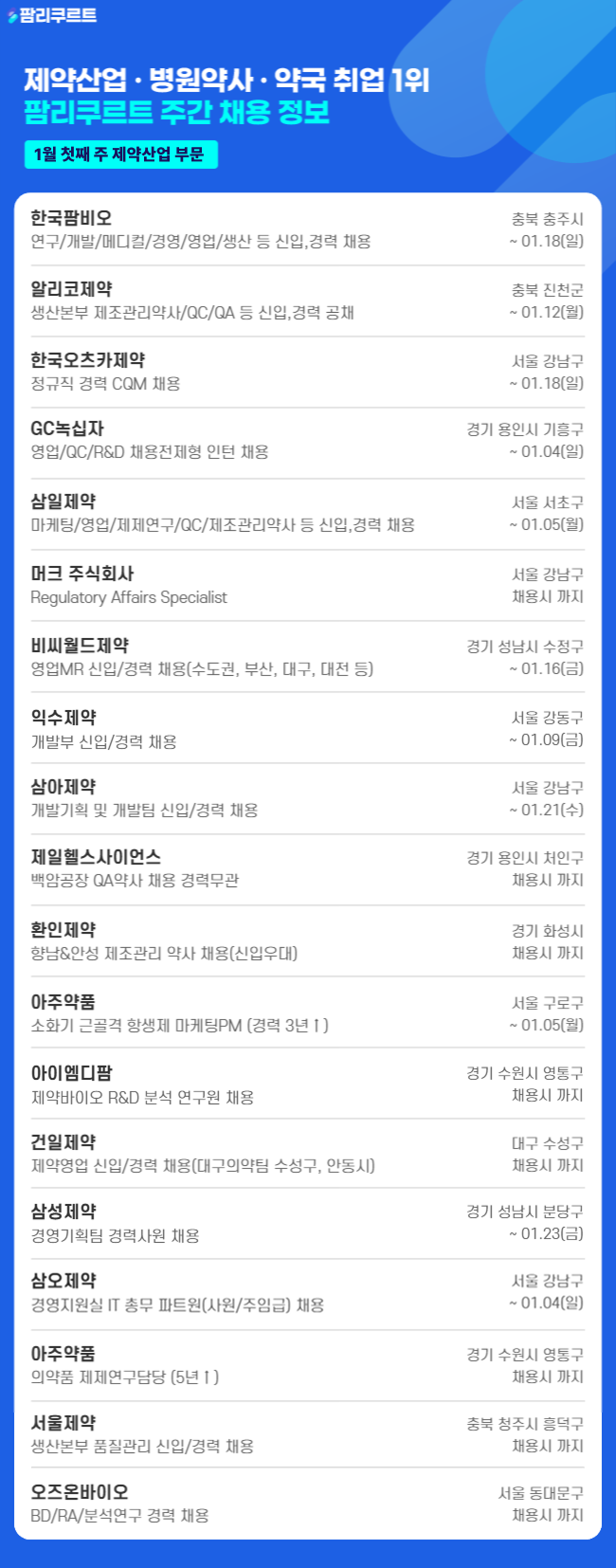 [팜리쿠르트] 한국팜비오·알리코·한국오츠카 등 부문별 채용