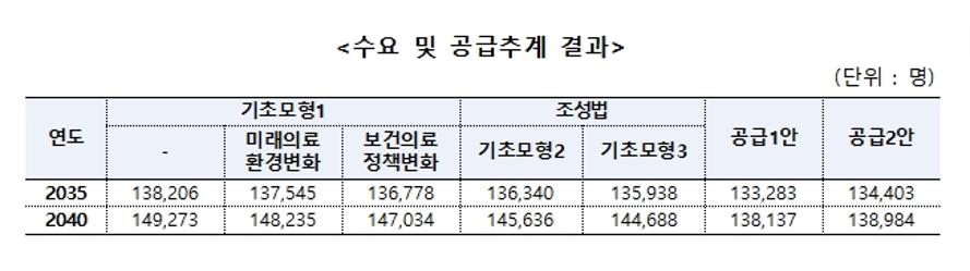 복지부는 "기초모형 기준 추계 결과 2035년에는 수요 13만5938명~13만8206명, 공급 13만3283명~13만4403명으로 총 1535명~4923명의 의사인력 부족이 발생할 것으로 추정됐다"고 밝혔다.