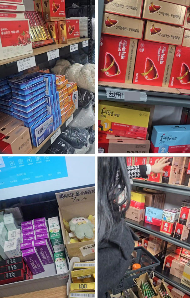 홍삼, 유산균, 석류스틱, 오메가3, 체중조절용 식품, 커피, 과자, 차, 치약, 인형 등 다양한 품목이 진열장 내지 박스에 진열돼 있었으며 의약품도 파스, 간장제, 점안액, 연고 등이 구비돼 있었다는 것.