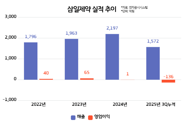 삼일제약은 베트남 공장 가동을 앞두고 인력 확충과 설비 감가상각, 품질 시스템 구축 비용을 선반영했다. 아직 본격적인 생산과 매출이 발생하지 않은 단계에서 고정비가 먼저 반영되며 수익성이 일시적으로 악화된 구조다. 실제로 2024년 영업이익은 1억원으로 전년(64억원) 대비 급감했고, 지난해 3분기 누적 기준으로는 136억원의 영업손실을 기록하며 적자 전환했다.