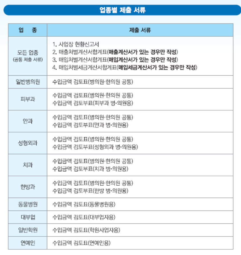 사업자가 매출계산서, 매입(세금)계산서, 매입자발행(세금)계산서를 발급하거나 받은 경우에는 매출처별계산서합계표, 매입처별(세금)계산서합계표, 매입자발행(세금)계산서합계표를 제출해야 하며 의료업, 학원업 등을 운영하는 신고대상 사업자는 사업장 현황신고서와 업종별 수입금액 검토표를 함께 제출해야 한다.