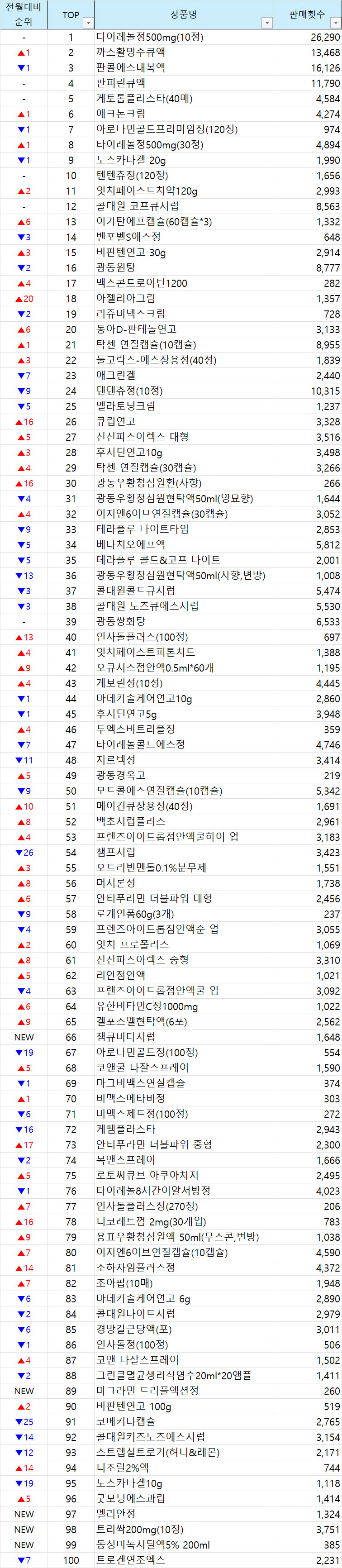 판콜·판피린을 비롯해 콜대원, 원탕, 테라플루, 쌍화탕 등 매출이 줄줄이 감소했다. 반면 SNS에서 입소문을 탄 아젤리아크림와 큐립연고는 전 달 대비 37.2%, 21.1% 판매량이 증가했고 어린이종합영양제 챔큐비타는 순위권 내에 새롭게 이름을 올렸다.