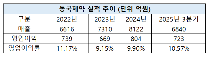 이같은 흐름은 전체 실적에서도 나타나고 있다. 동국제약은 지난해 3분기 연결 기준 매출 6840억원, 영업이익 723억원을 기록했다. 전년 대비 각각 13.77%, 15.13% 증가했다. 회사는 올해를 외형 성장이 본격화되는 해로 보고 있으며 연매출 1조원 클럽 진입을 목표로 하고 있다.