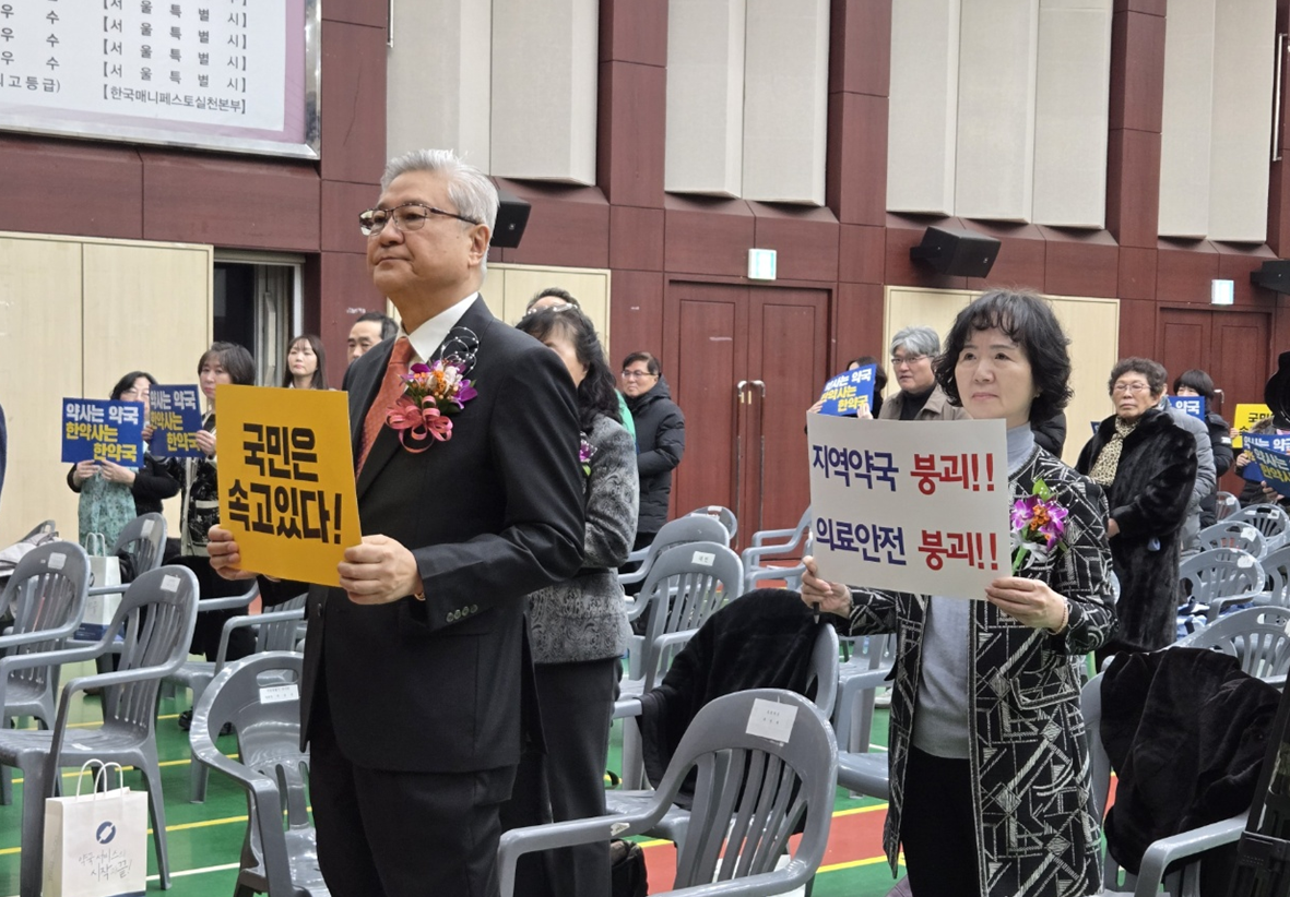 윤종일 회장도 "지난 한 해는 위기, 위기, 위기 속에 살아왔으며 약사의 역할과 약국의 존립 자체가 흔들리는 상황"이라며 "전국에서 가장 큰 1000평 약국이 동대문 한 중심에 들어설 준비를 하고 있다. 이는 경쟁의 문제도, 약국이 하나 더 생기는 문제도 아닌 약국 질서가 무너지고 지역 약국들이 연쇄적으로 타격을 받아 도살되게 되는 생존의 문제"라고 꼬집었다.