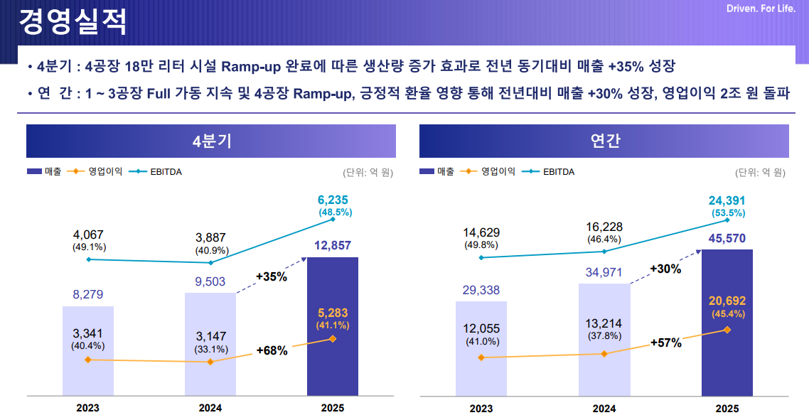 이번 호실적은 4공장 램프업과 1~3공장의 안정적인 풀가동이 맞물리며 생산량이 크게 늘어난 결과다. 여기에 우호적인 환율 환경까지 더해지면서 외형 성장과 수익성 개선이 동시에 나타났다는 게 회사 측 설명이다.