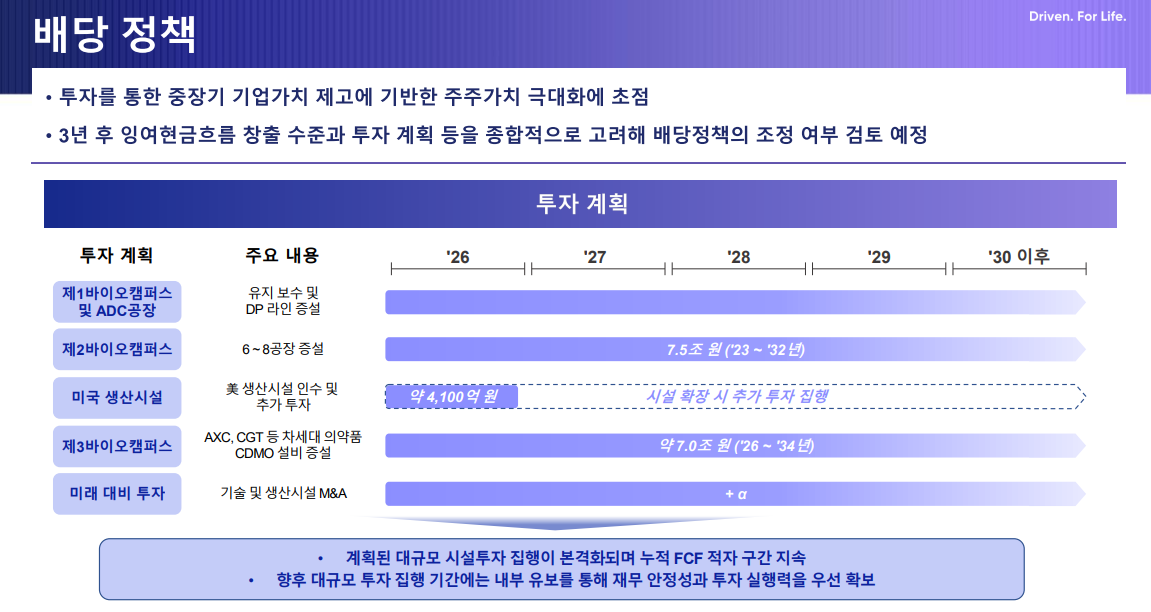 삼성바이오로직스는 설립 이후 단 한 차례도 배당을 실시하지 않았다. 2016년 상장 이후에도 이익 배분보다는 대규모 설비 투자와 생산능력 확충에 재원을 우선 투입해 왔다. 삼성바이오로직스는 당초 2025년 이후 당해 FCF의 10% 내외에서 현금 배당 여부를 검토하겠다고 밝혔으나 대규모 설비 투자로 FCF 적자 구간이 이어질 것으로 예상됨에 따라 배당 논의는 중장기 과제로 남게 됐다.