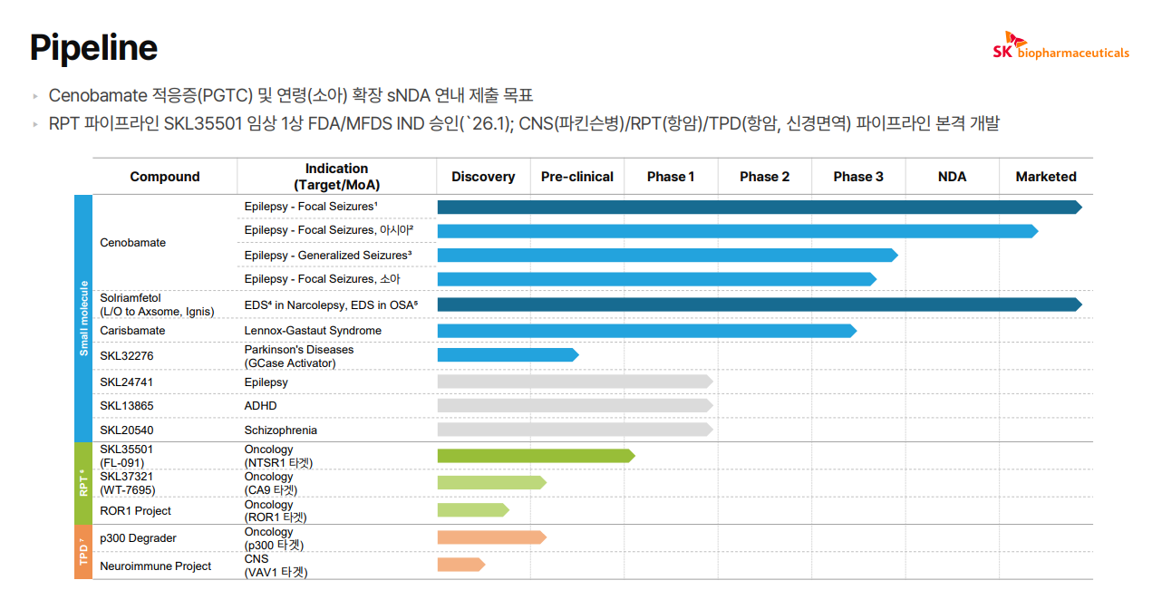차세대 성장 축으로 꼽히는 방사성의약품 치료제(RPT) 분야에서는 단일 후보물질이 아닌 플랫폼 전략을 강조했다. 회사는 현재 사는 액티늄-225 기반 NTSR1 표적 RPT 후보물질 'SKL35501'을 비롯해 루테슘-177 기반 CA9 표적 RPT 후보물질 'SKL37321', ROR1 겨냥 퍼스트-인-모달리티 후보물질 등 다수의 RPT 파이프라인을 동시에 전개 중이다.