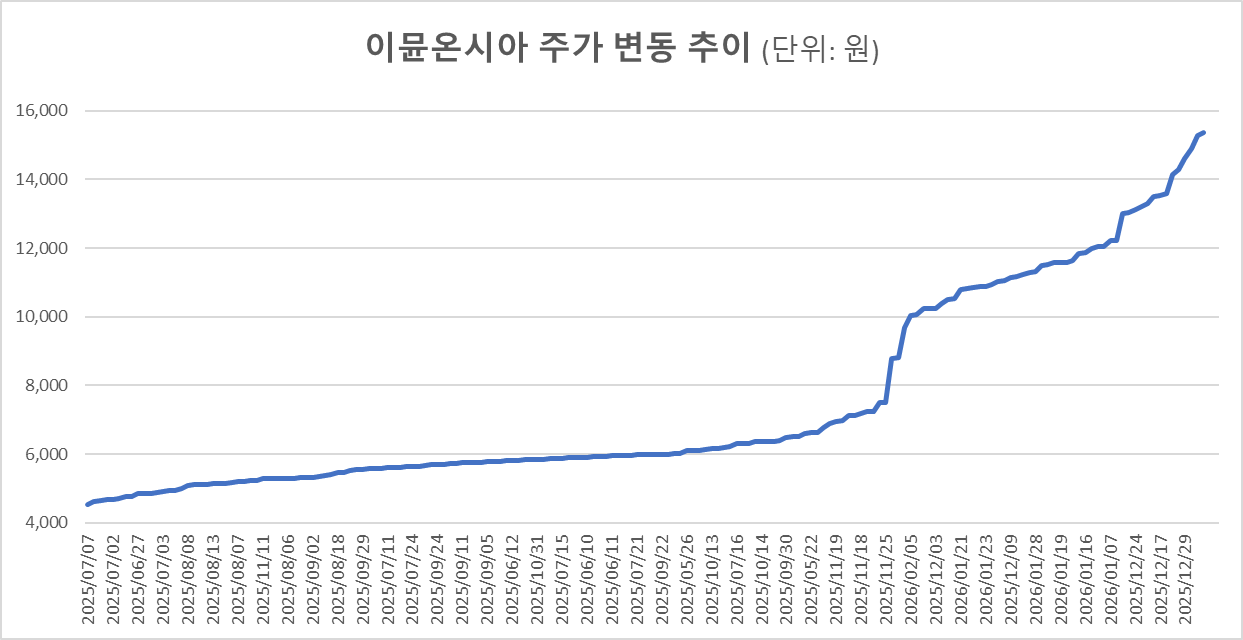 이뮨온시아 주가는 상장 직후 조정 국면을 거친 뒤 점진적인 회복 흐름을 보이다가 지난해 하반기 들어 상승 탄력이 다시 붙었다. 이뮨온시아 주가는 11월 말부터 급등세를 타기 시작해 작년 12월 중순 16만110원까지 오르며 상장 이후 최고가를 기록했다. 이후 주가는 등락을 거듭해 최근 9000원 안팎에서 거래되고 있다.