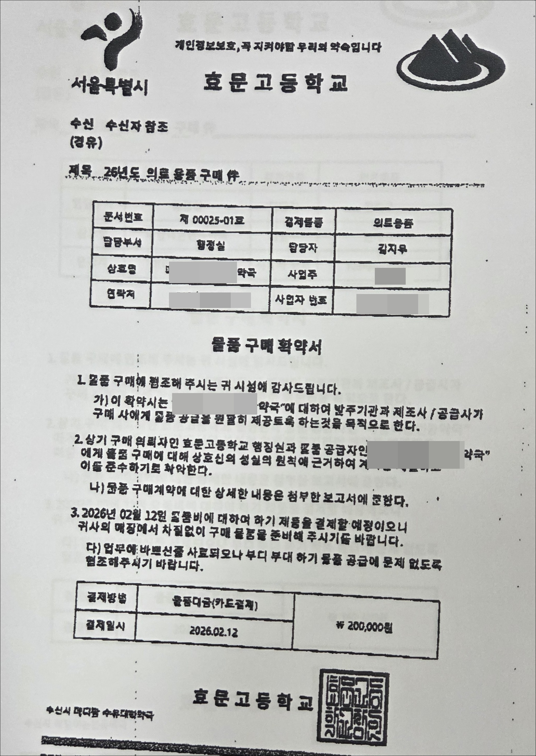 또 ‘상기 구매 의뢰자인 효문고등학교 행정실과 물품 공급자인 ○○약국에게 물품 구매에 대해 상호신의 성실 원칙에 근거해 계약을 체겨라고 이를 준수하기로 확약한다’고 기재됐다.