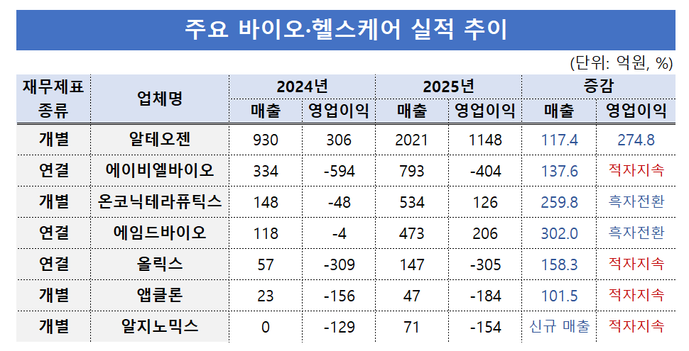 14일 금융감독원에 따르면 알테오젠, 에임드바이오, 온코닉테라퓨틱스, 에이비엘바이오 등 주요 바이오 기업의 지난해 실적이 큰 폭으로 개선됐다.