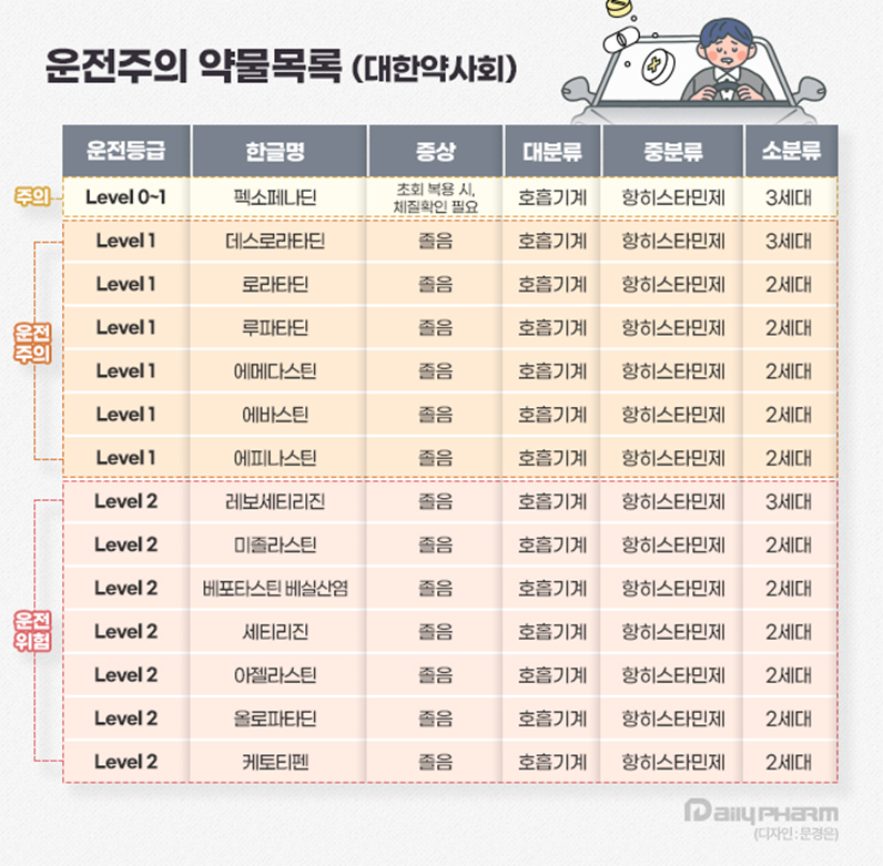 반면 데스로라타딘, 로라타딘, 루파타딘, 에바스틴, 에피나스틴, 에메다스틴 등 일부 2세대 및 3세대 항히스타민제는 Level1 즉, 운전주의로 분류된다. 졸음 발생 가능성이 낮은 편이지만 개인에 따라 주의력 저하가 나타날 수 있어 운전 전 복용 시 주의가 필요하다.
