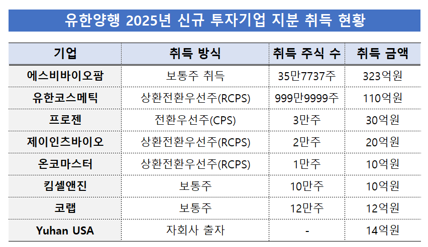 가장 큰 취득 규모는 에스비바이오팜이다. 유한양행은 지난해 에스비바이오팜 보통주 35만7737주를 취득하며 323억원을 투자했다. 이와 함께 기존 상환전환우선주 일부를 보통주로 전환하면서 장부가 43억원 감소도 반영했다.