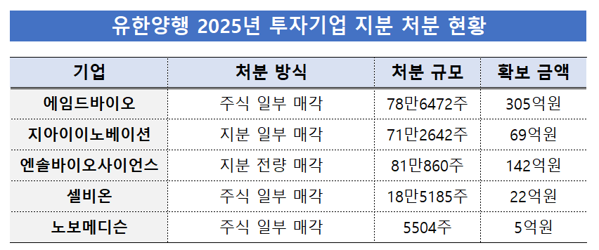 유한양행은 에임드바이오, 지아이이노베이션, 엔솔바이오사이언스, 셀비온, 노보메디슨 등 투자기업 지분 일부를 처분했다.