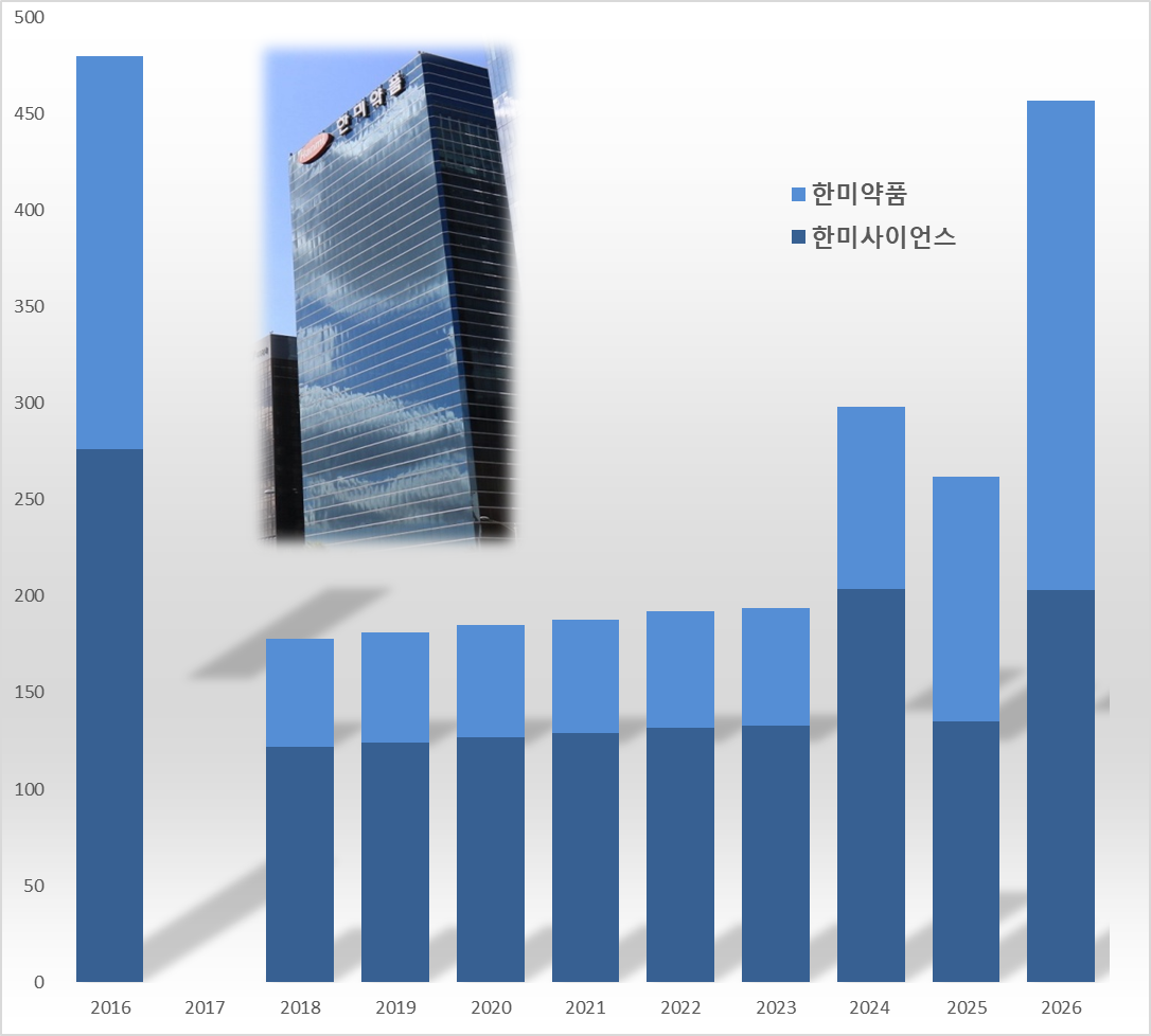 한미약품과 한미사이언스의 합산 배당금은 총 457억원으로 2016년 480억원 이후 10년 만에 최대 규모다.