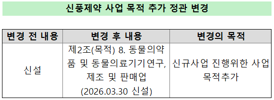 업계에 따르면 신풍제약은 최근 정관 변경을 통해 동물용 의약품 및 관련 사업을 사업 목적에 추가하는 방안을 추진하고 있다. 기존 인체 의약품 중심의 사업 구조에서 벗어나 동물의약품 시장으로 사업 영역을 확장하려는 전략으로 풀이된다.