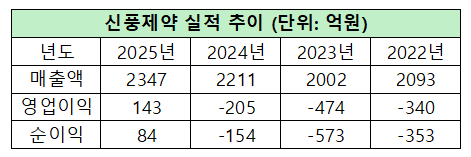 금융감독원 전자공시시스템에 따르면 신풍제약의 지난해 연결 기준 매출은 2346억8065만원으로 전년 대비 6.15% 증가했다. 같은 기간 영업이익은 142억5516만원을 기록하며 전년 영업손실 204억5543만원에서 흑자 전환했고, 당기순이익도 82억3710만원으로 흑자로 돌아섰다.