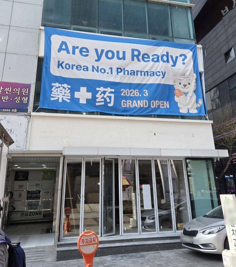 건물 외벽에는 3월 오픈을 알리는 대형 플래카드가 부착된 채 인테리어 공사가 한창이다. 기존 식당으로 운영되던 자리가 약국으로 탈바꿈하는 것이다. 건물 내에는 치과와 성형외과가 입점해 있다.