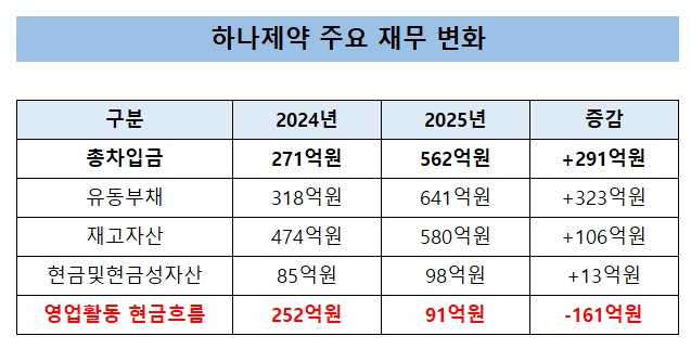 하나제약 총차입금 271억→562억…유동성 부담 확대