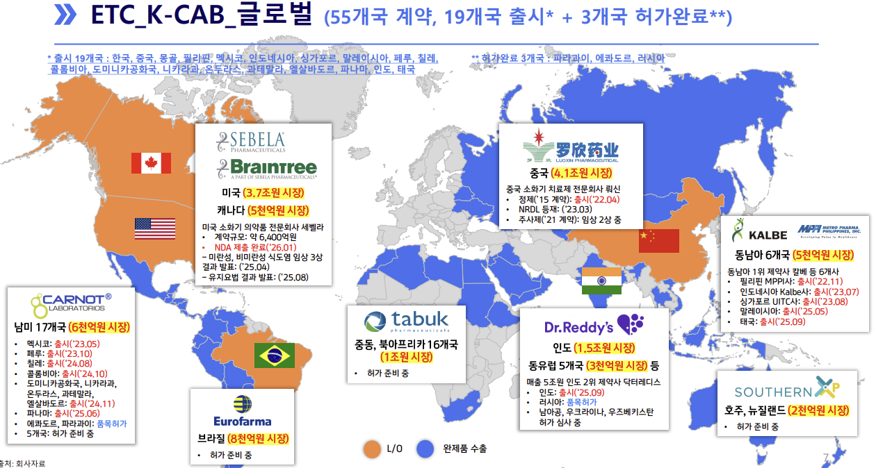 지난 2019년 2월엔 멕시코 제약사 카르놋과 중남미 17개국에 케이캡 완제의약품 수출 계약을 체결했다. 제품 공급금액을 포함해 10년 간 8400만달러 규모다. HK이노엔은 이후 인도네시아, 태국, 필리핀, 몽골, 싱가포르, 베트남, 말레이시아, 미국, 캐나다 등에 케이캡의 수출 계약을 맺었다. 2024년 1월에는 호주 제약사 서든 엑스피와 호주 및 뉴질랜드에 케이캡을 수출하는 계약을 맺었다. HK이노엔은 지난해 5월 사우디아라비아 제약사 타부크 제약과 이집트를 포함한 북아프리카 6개국에 케이캡 완제품 공급계약을 맺었다.
