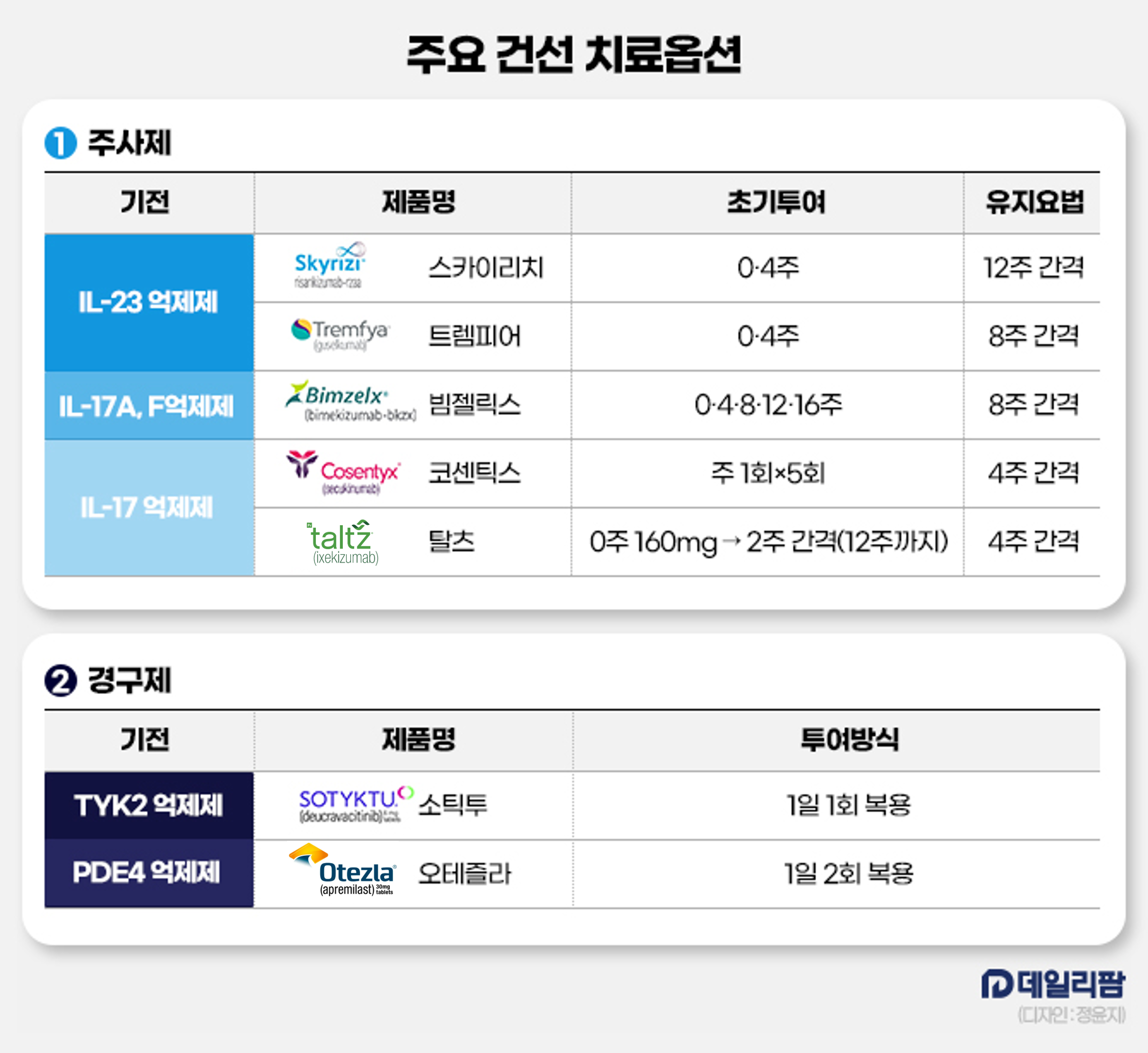 건선 치료는 현재 기전과 제형에 따라 4개 축으로 재편되는 흐름이다. 주사형 생물학적제제와 경구 치료제가 각각 두 개 축을 형성하며 경쟁 구도를 만들고 있다.