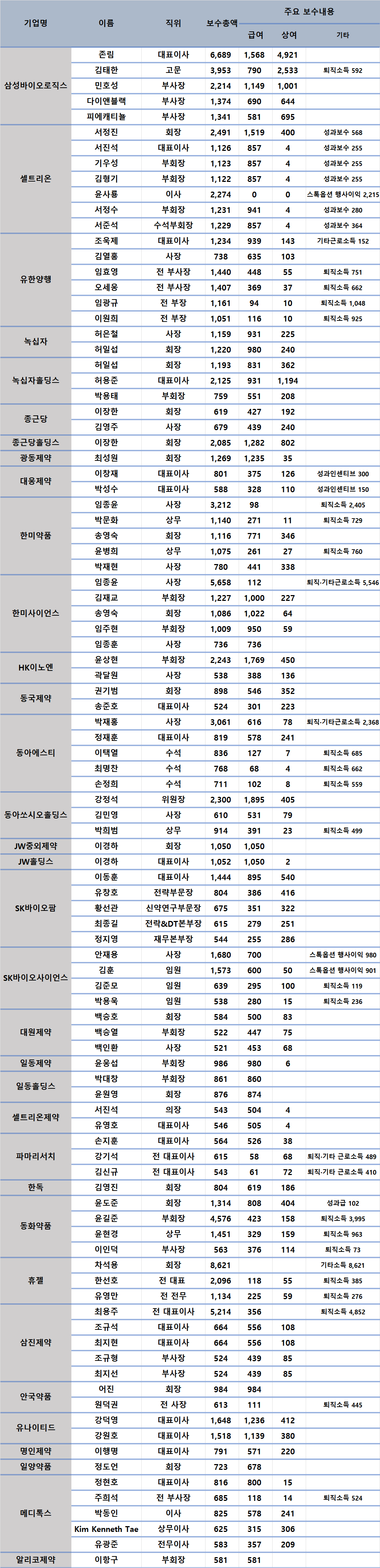 21일 금융감독원에 따르면 주요 상장 제약바이오기업 중 삼성바이오로직스, 셀트리온, 유한양행, 녹십자, 녹십자홀딩스, 종근당, 종근당홀딩스, 광동제약, 대웅제약, 한미약품, 한미사이언스, HK이노엔, 동국제약, 동아에스티, 동아쏘시오홀딩스, JW중외제약, JW홀딩스, SK바이오팜, SK바이오사이언스, 대원제약, 일동제약, 일동홀딩스, 셀트리온제약, 파마리서치, 한독, 동화약품, 휴젤, 삼진제약, 안국약품, 유나이티드제약, 명인제약, 일양약품, 메디톡스, 알리코제약 등이 핵심 임원들에게 5억원 이상의 보수를 지급한 것으로 나타났다.