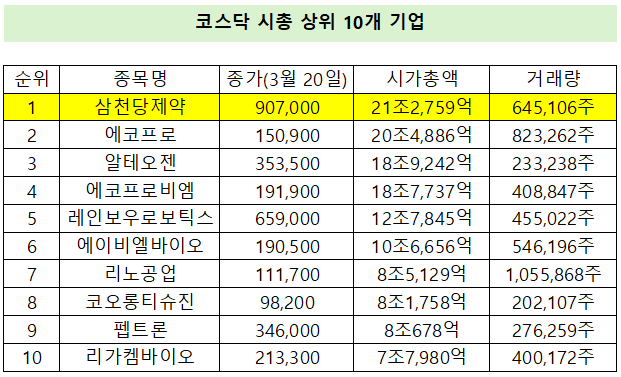 - 9시총 21조 삼천당제약, 코스닥 1위…영업익 100억 미만