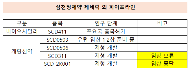 그 외에 개량신약 파이프라인은 사실상 당뇨병용제 'SCD0503', 'SCD0506' 두가지 뿐이다. 안구건조증 치료제 'SCD311'는 개발이 보류된 상태며 장정결제 'SCD-2K001'는 지난해 연구를 중단했다.