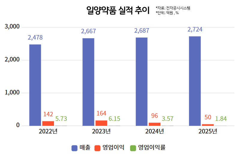 일양약품의 사업보고서에 따르면 지난해 매출은 2724억원으로 전년 대비 1.93% 증가했지만, 영업이익과 당기순이익은 각각 50억원, 71억원으로 48.43%, 23.16% 감소했다. 2020년 3433억원이던 매출은 이후 2400억~2700억원 수준에 머물며 정체된 흐름을 보이고 있다. 이는 중국 법인 관련 이슈에 따른 법률비용과 금융당국 과징금 등이 영향을 미친 것으로 분석된다.