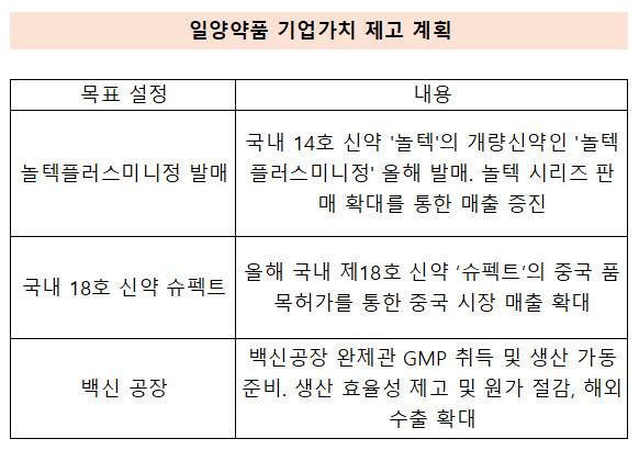 특히 ‘놀텍플러스미니정’ 출시와 슈펙트의 중국 품목허가 신청(NDA)을 올해 추진할 계획이다. 또한 충북 음성 백신공장 완제라인은 증축을 완료하고 현재 식품의약품안전처의 GMP 승인을 기다리고 있다. 승인 이후 본격적인 생산과 수출 확대에 나설 방침이다.