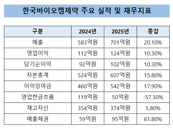 한국바이오켐제약은 2025년 매출 701억원을 기록하며 전년(583억원) 대비 20.1% 증가했다. 같은 기간 영업이익(112억→124억원)과 순이익(92억→102억원)은 각 10.3% 늘었다. 외형과 수익성이 동시에 개선됐다. 매출 700억원 돌파는 설립 이후 처음이다.