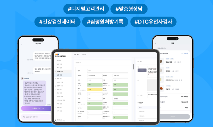 저렴한 영양제를 넘어 내 몸에 딱 맞는 밀착 관리를 원하는 소비자들이 꾸준히 늘고 있고, 이 가운데 메디코치가 프리미엄 헬스케어 센터로 도약할 수 있도록 강력한 상담 플랫폼을 제공하고 있다는 것이다.