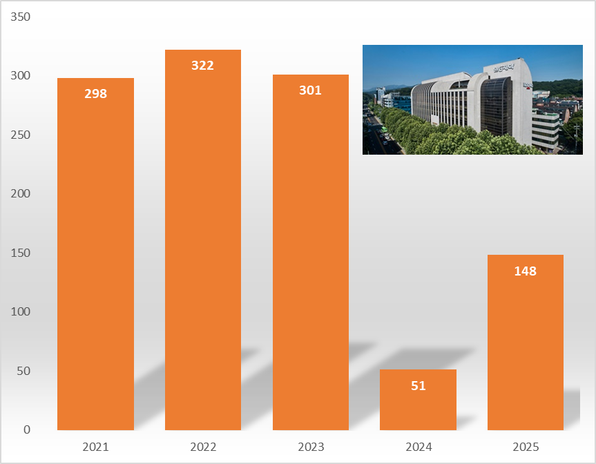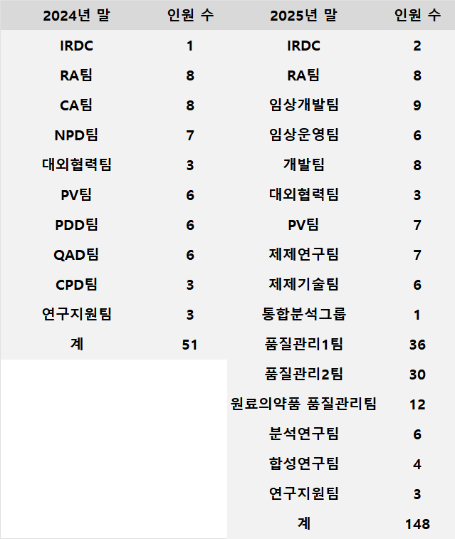 일동제약의 연구인력 수는 2022년 322명, 2023년 301명에서 연구개발 부문 분사로 급감했다.
