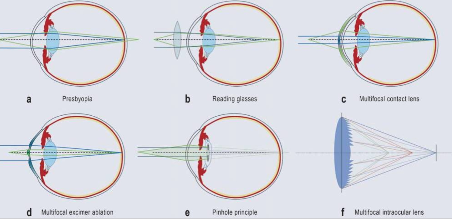 Figure 1은 노안의 비수술적 및 수술적 교정 방법을 도식적으로 나타낸 것으로, 녹색 선은 가까운 물체에서 오는 빛을, 파란색 선은 먼 물체에서 오는 빛을 의미한다.