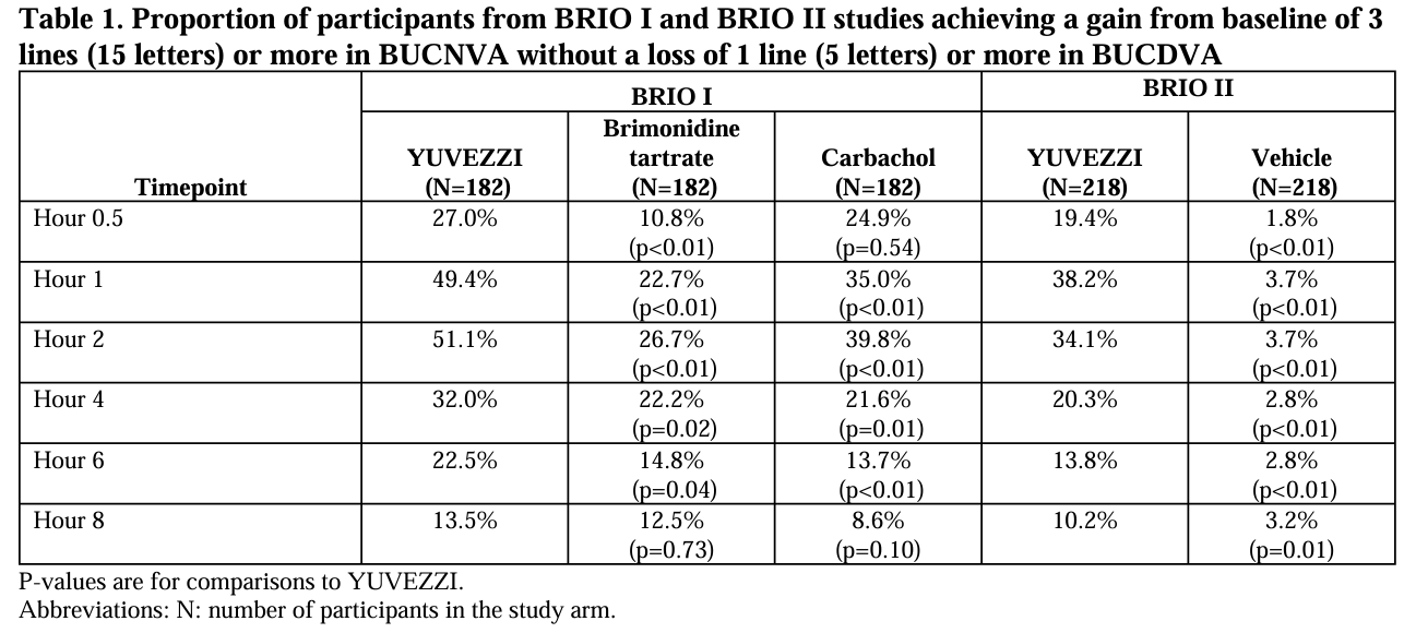 BRIO II 연구에서는 모든 주요 근거리 시력 개선 지표를 달성하였고, 8시간 동안 양안 나안 근거리 시력(BUNVA)에서 통계적으로 유의한 3줄 이상의 시력 향상이 확인되었다. 또한 양안 나안 원거리 시력(BUDVA)에서는 1줄 이상의 시력 저하가 나타나지 않았다.