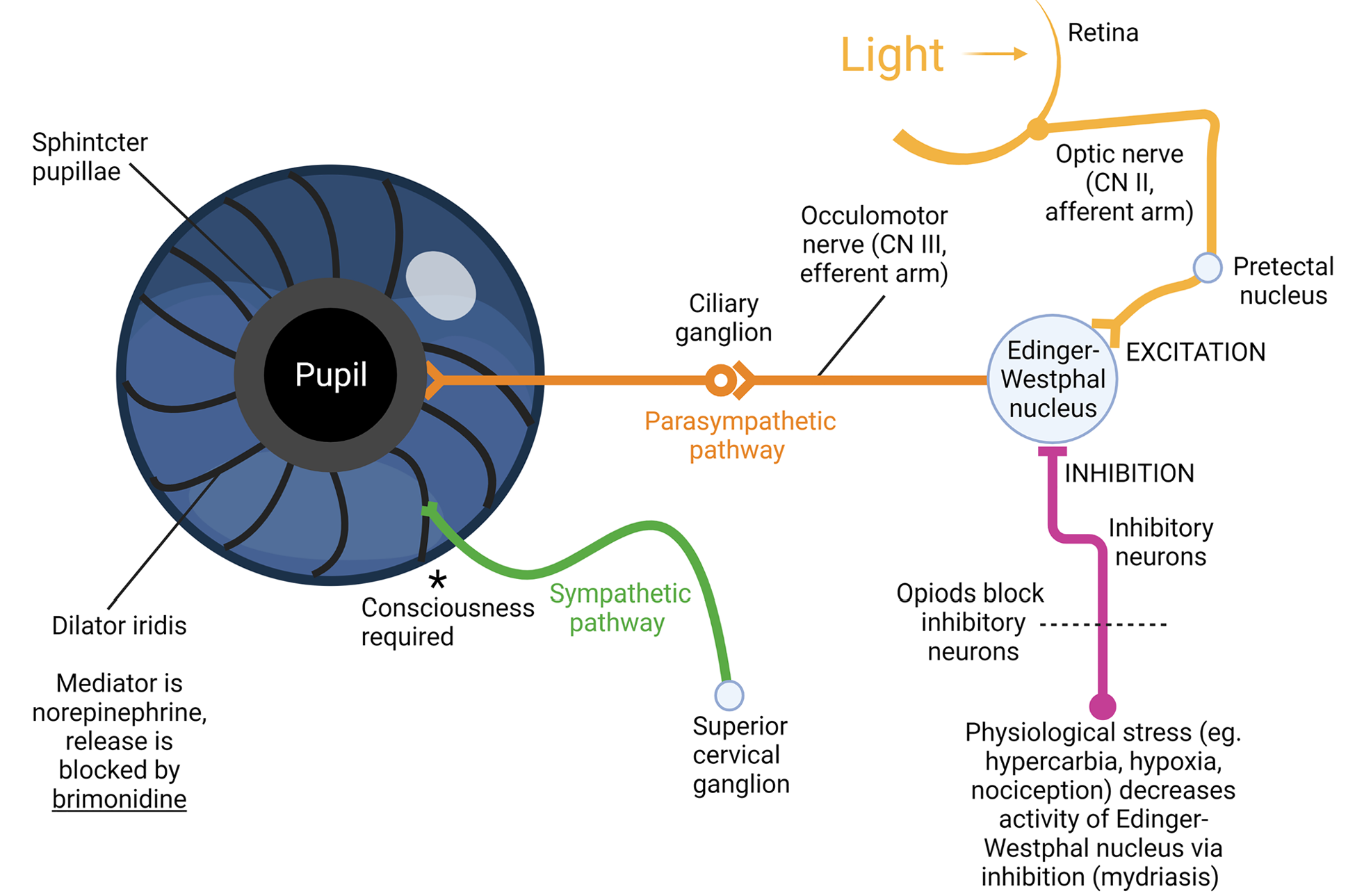 동공 크기 조절의 가장 핵심적인 기전은 자율신경계(autonomic nervous system)에 의해 매개된다. 부교감신경계는 동안신경(oculomotor nerve)을 통해 신호를 전달하여 무스카린 수용체를 활성화하고, 이에 따라 홍채 괄약근이 수축하면서 동공 수축(miosis)이 일어난다.