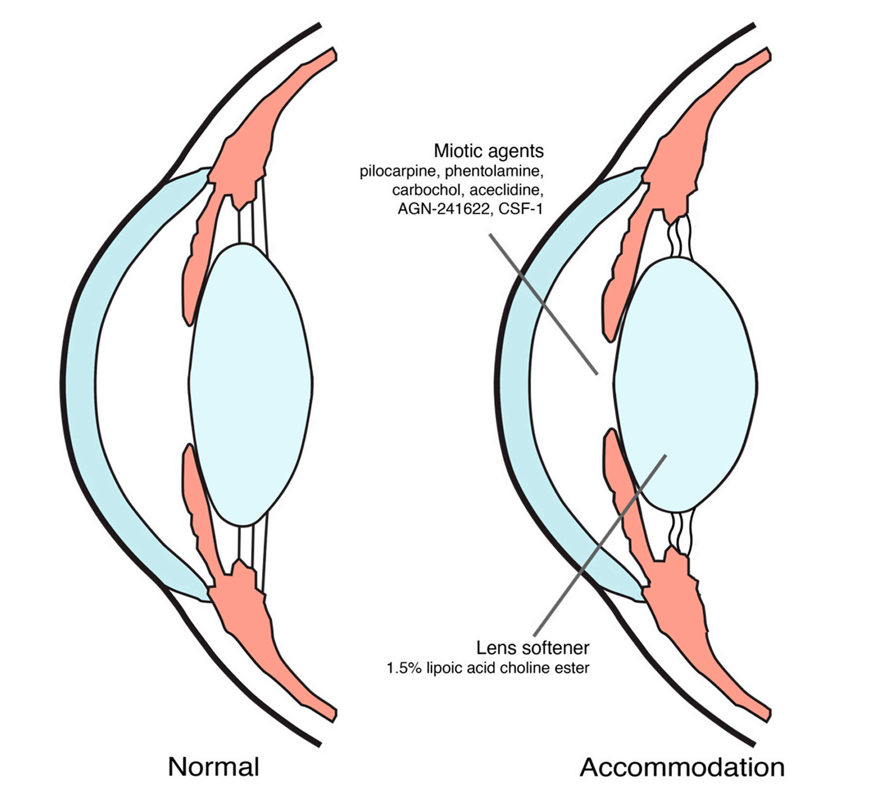 현재 대부분의 노안 약물 치료법은 부교감 신경 경로를 통해 초점 심도를 증가시키기 위해 일시적인 동공 축소를 유도하여 핀홀 효과를 내는 것을 목표로 한다.