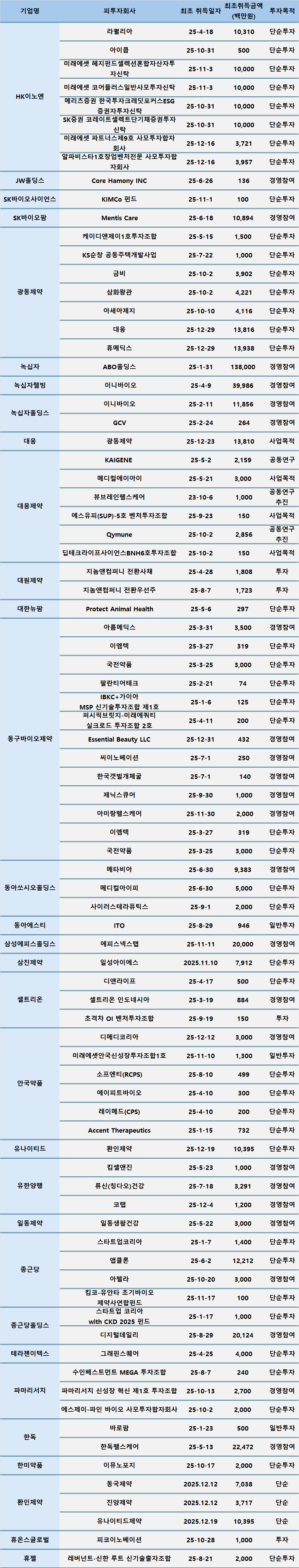 SK바이오사이언스, 광동제약, 대웅제약, 동구바이오제약, 셀트리온, 안국약품, 종근당, 종근당홀딩스, 파마리서치, 휴젤 등이 투자조합이나 사모펀드 등을 대상으로 새로운 투자를 진행했다.