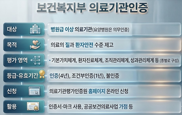 현행법은 병원급 의료기관과 대통령령으로 정하는 의료기관을 복지부 인증 대상으로 규정중이다. 이 중 의무적으로 인증을 받아야 운영 가능한 대상을 요양병원이다.