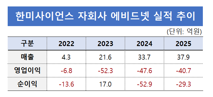 한미사이언스 인수 이후에도 에비드넷은 영업손실을 지속했다. 인수 이듬해인 2024년 에비드넷 매출은 34억원으로 전년 대비 56% 증가했으나 영업손실 48억원을 기록했다. 지난해 역시 매출 38억원으로 전년 대비 12% 늘었지만 영업손실은 41억원대에 머물렀다.