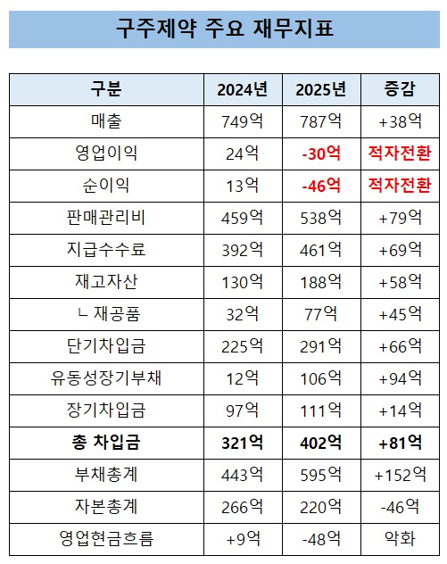 2025년 매출은 787억원으로 전년 749억원 대비 증가했다. 영업이익은 24억원 흑자에서 30억원 손실로 돌아섰고, 당기순이익도 13억원에서 46억원 순손실로 전환됐다.