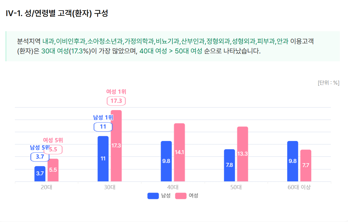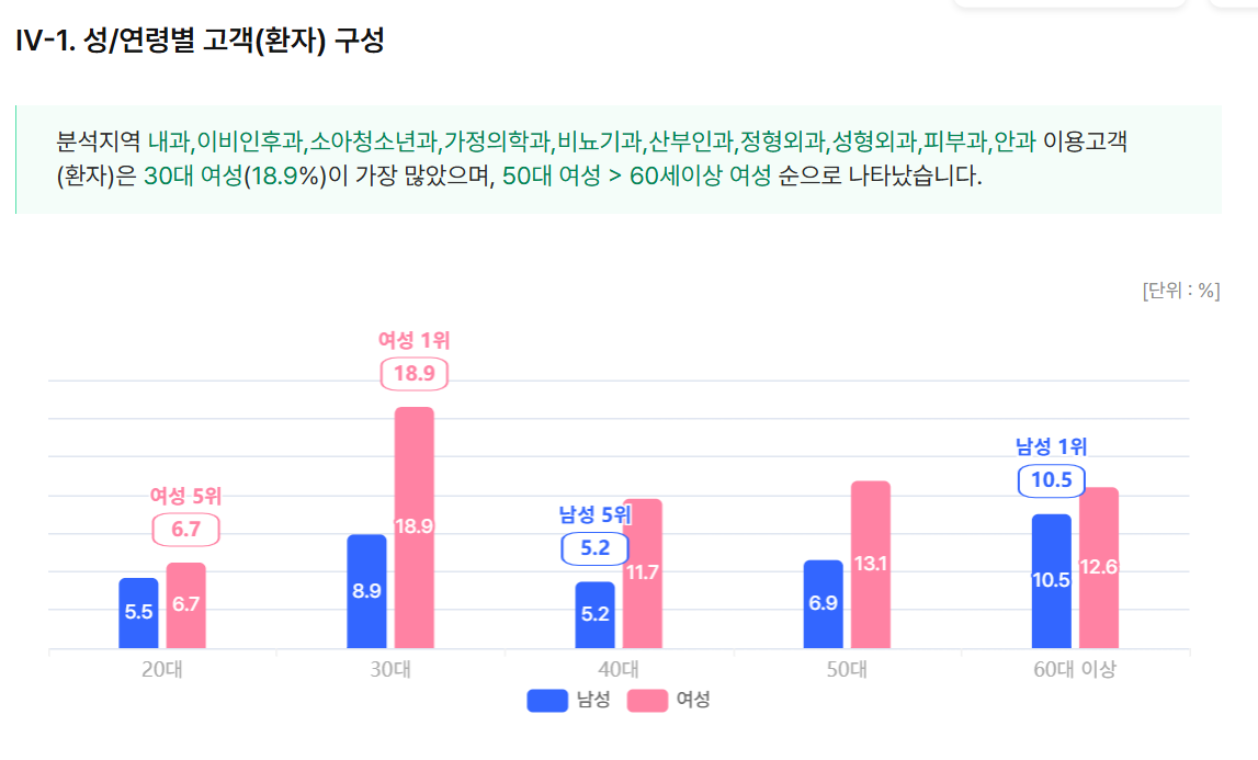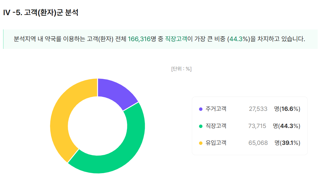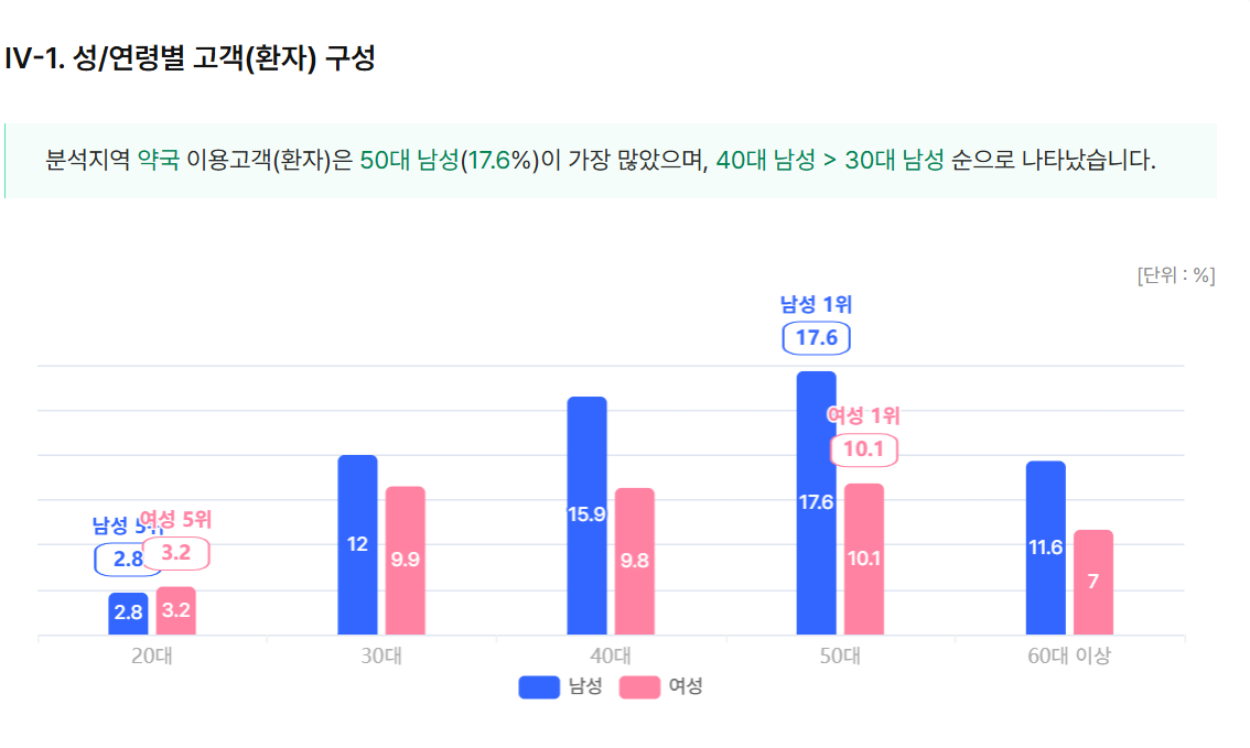 여의도의 경우 의원 환자의 주 연령층이 30대, 40대 여성인 것과 달리 약국은 50대 남성이 17.6%로 가장 비중이 높았고, 이상 40대 남성이 15.9%, 30대 남성 12%, 60대 이상 남성 11.6% 등의 순이었다. .