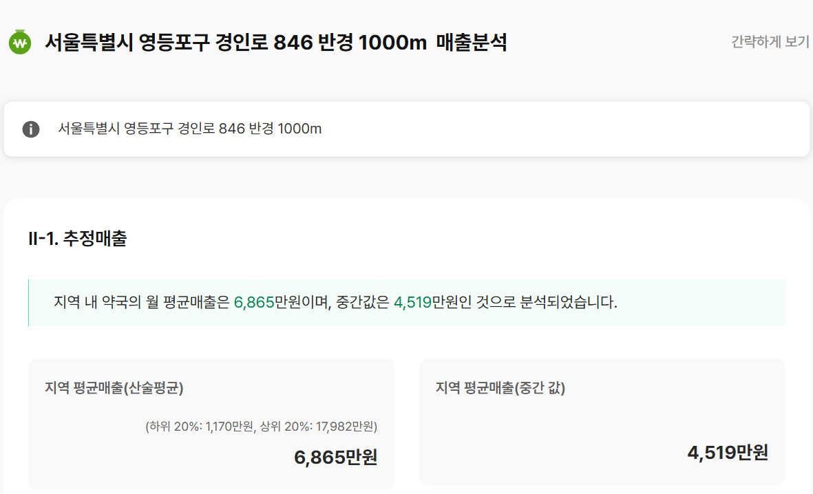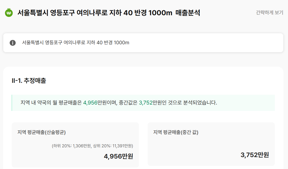 영등포 약국의 추정매출은 6865만원, 여의도 약국은 4956만원으로, 영등포가 1.5배 정도 높은 것으로 나타났다.
