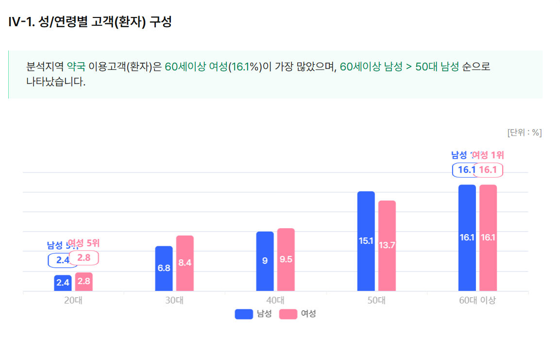 영등포 약국의 경우 60대 이상 여성과 남성이 각 16.1%로 가장 높았고, 50대 남성이 15.1%, 50대 여성 13.7%, 40대 여성 9.5%, 40대 남성 9% 순으로 나타났다.