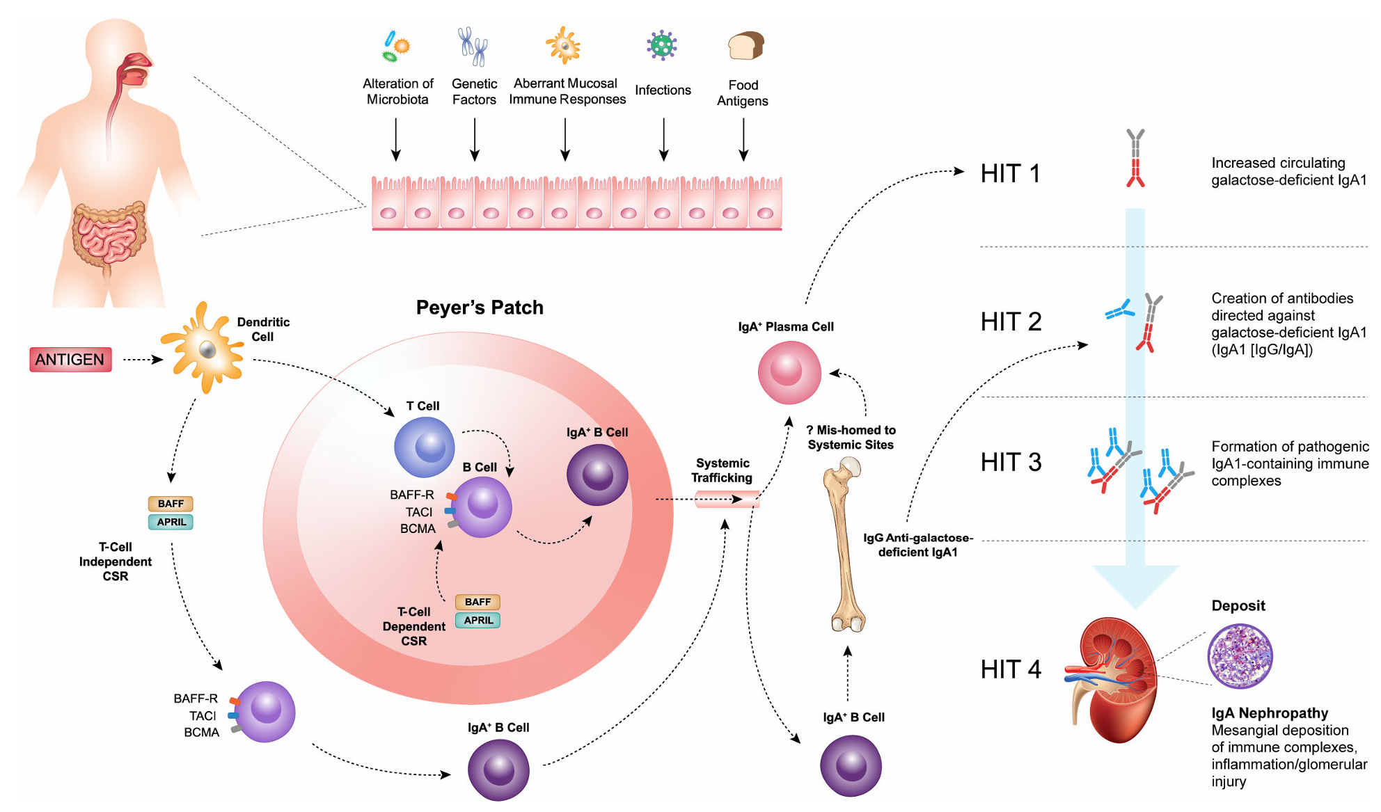 정상적인 점막 면역에서 IgA 생성으로의 전환은 필수적인 방어 기전으로, IgA는 점막 표면에서 병원체를 중화하고 공생 미생물과의 항상성을 유지하는 역할을 한다. 그러나 IgAN에서는 B 세포 활성화 및 CSR 과정의 이상으로 인해 Gd-IgA1이 과도하게 생성된다.