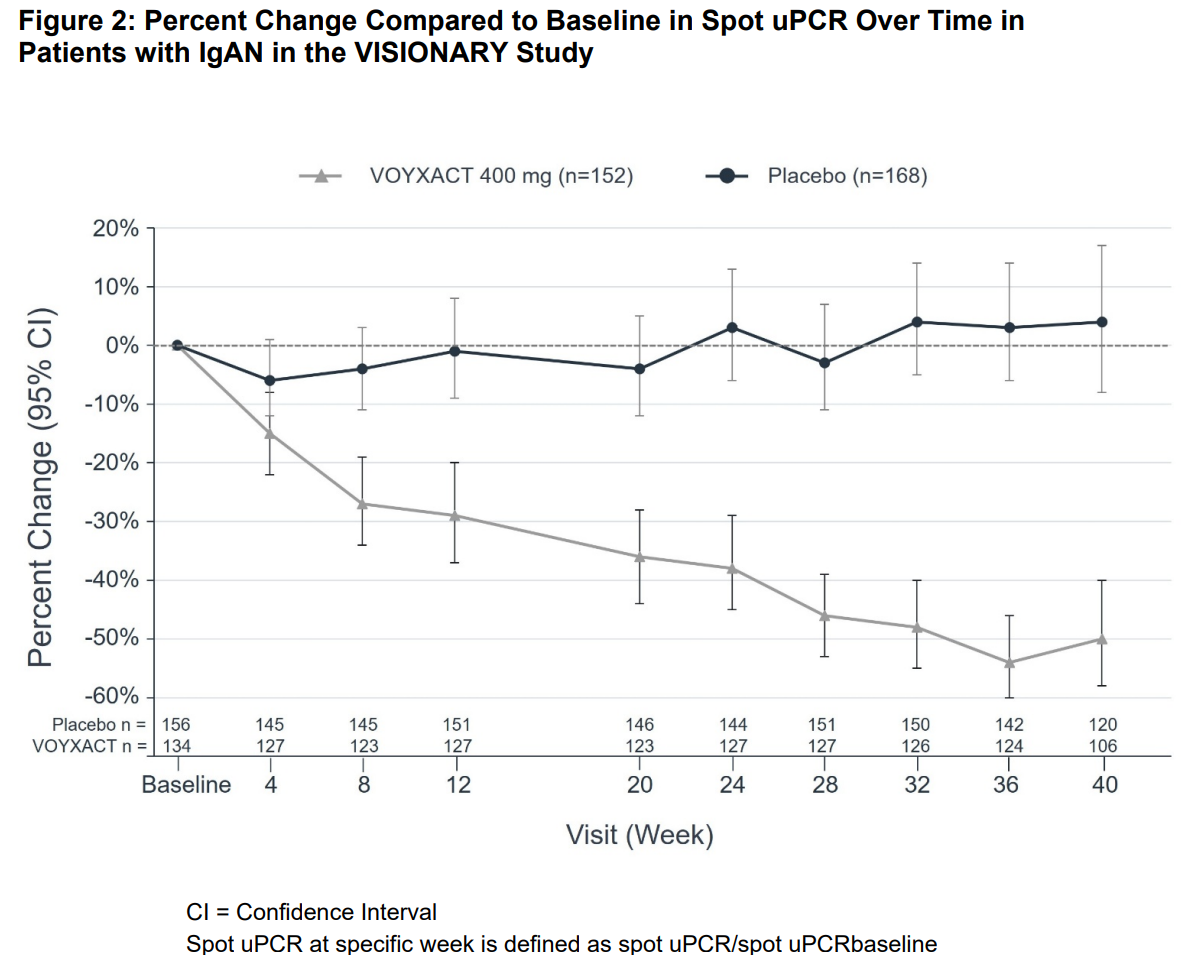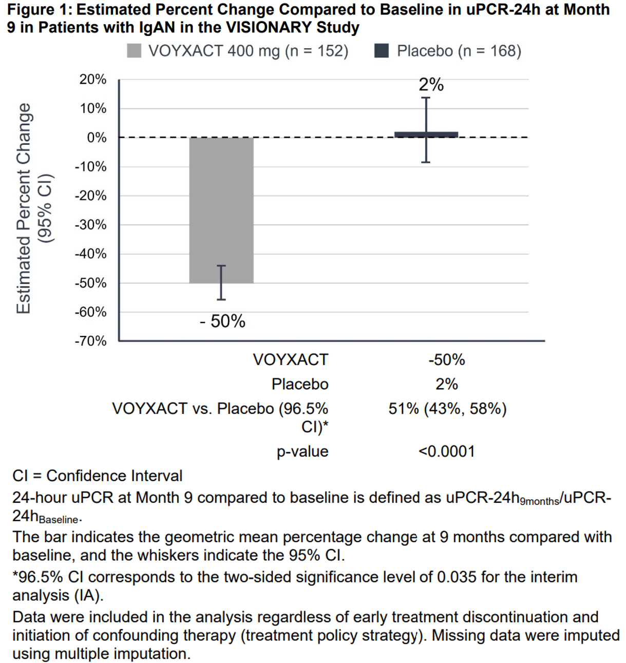 VOYXACT의 단백뇨에 대한 효과는 생검으로 IgA 신병증이 확인된 성인 환자를 대상으로 한 무작위 배정, 이중눈가림, 위약 대조, 다기관 글로벌 임상시험(VISIONARY)에서 평가되었다.