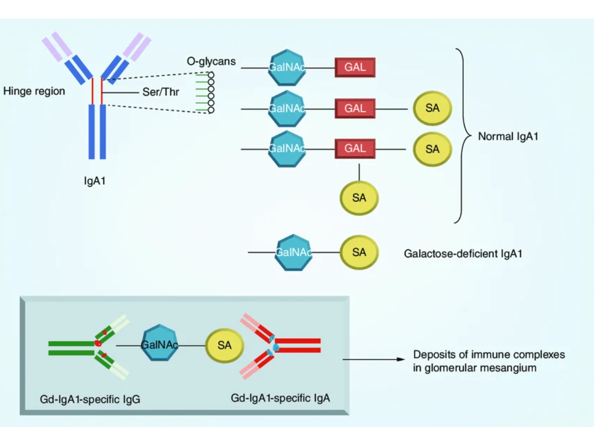 그러나 IgAN 환자에서는 IgA1의 당화 과정에서 갈락토스 결핍이 발생하며, 이로 인해 시알산이 갈락토스 대신 GalNAc에 결합하게 된다. 그 결과 갈락토스 결핍 IgA1(galactose-deficient IgA1, Gd-IgA1)이 형성된다. 혈중 Gd-IgA1이 증가하면 이에 대한 자가항체(IgA 또는 IgG)가 생성되고, 이들이 결합하여 순환 면역복합체를 형성한다(Figure 1).