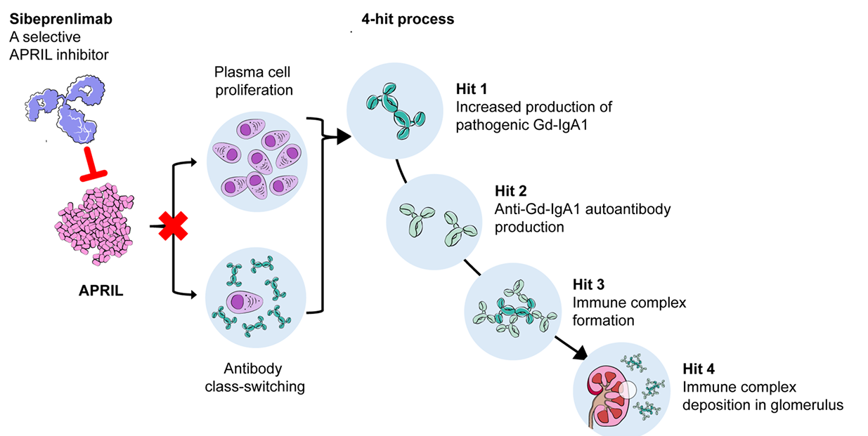 IgAN에서는 점막 유래 IgA, 특히 Gd-IgA1의 과도한 생성이 병인의 핵심 기전으로 작용한다. 이에 따라 IgA 생성에 직접적으로 관여하는 APRIL 경로가 중요한 치료 표적으로 제시된다. APRIL을 선택적으로 차단할 경우 IgA 생성과 형질세포 유지가 억제되어, 병인 물질인 Gd-IgA1의 감소를 유도할 수 있다.