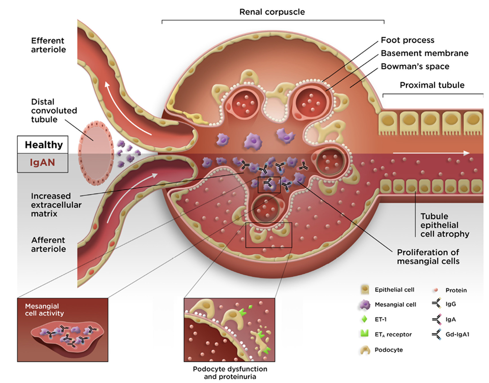 IgAN은 면역글로불린 A(IgA)가 신장에 축적되는 진행성 면역매개성 만성 신질환이다. IgA는 정상적으로 면역 체계의 구성 요소이나, 과도하게 축적될 경우 신장 염증을 유발하고 시간이 경과함에 따라 신장 조직의 섬유화를 초래한다. 이 질환은 주로 20~40세 성인에서 발병하며, 상당수 환자에서 평생에 걸쳐 말기 신부전(end-stage kidney disease, ESKD)으로 진행할 수 있다.