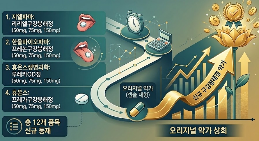 한올바이오파마의 프레논구강붕해정, 휴온스생명과학 루레카OD정, 휴온스 프레가구강붕해정이 동일 용량으로 진입하며 총 12개 품목이 신규 등재한다.
