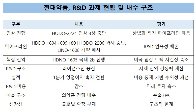결국 현대약품은 R&D와 사업 구조 두 측면에서 동시에 과제를 안고 있다. 파이프라인의 연속성과 글로벌 확장성을 입증해야 하는 동시에 내수 중심 구조에서 벗어난 성장 경로를 제시해야 한다는 의견이 나온다.